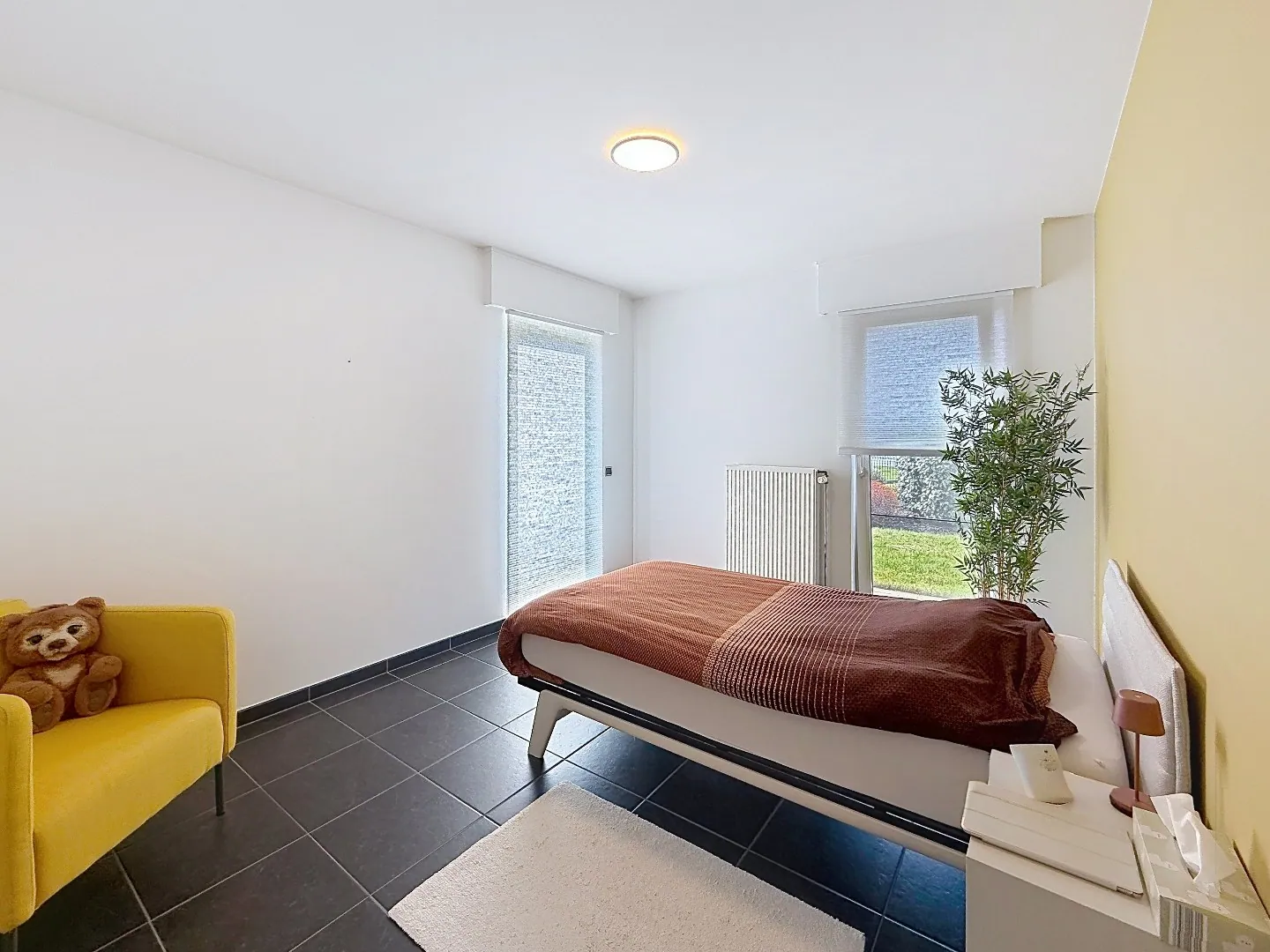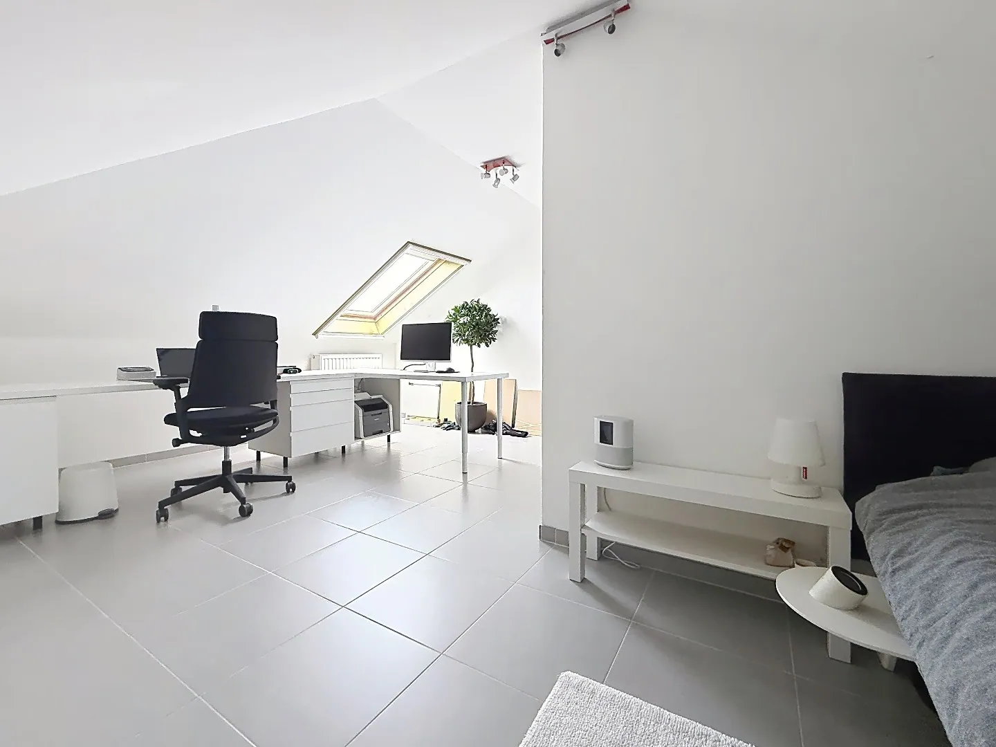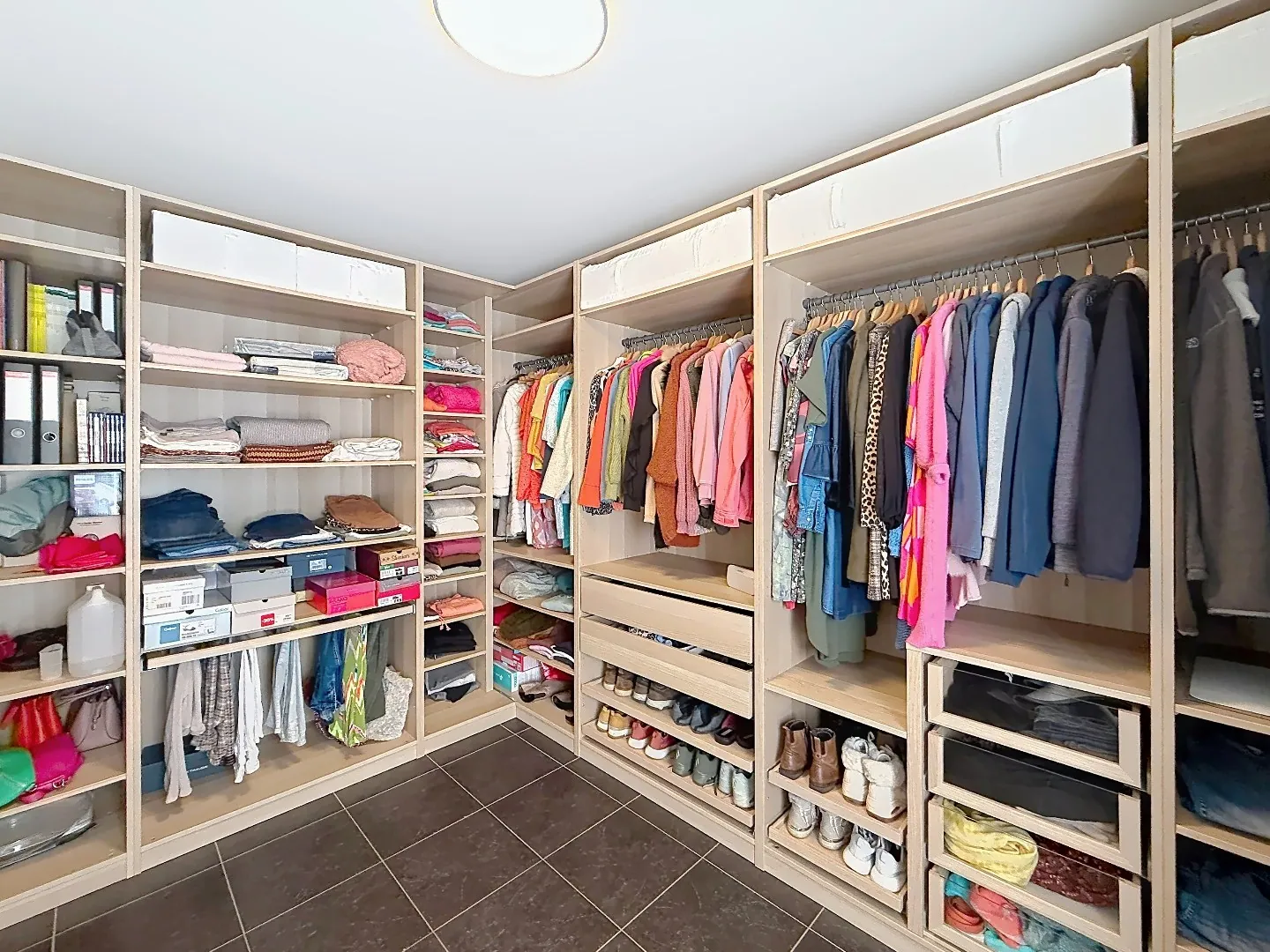 Meteen rechts bij het binnenkomen bevindt zich een stijlvolle dressing, die eveneens perfect kan ingericht worden als bureau of thuiswerkruimte.
