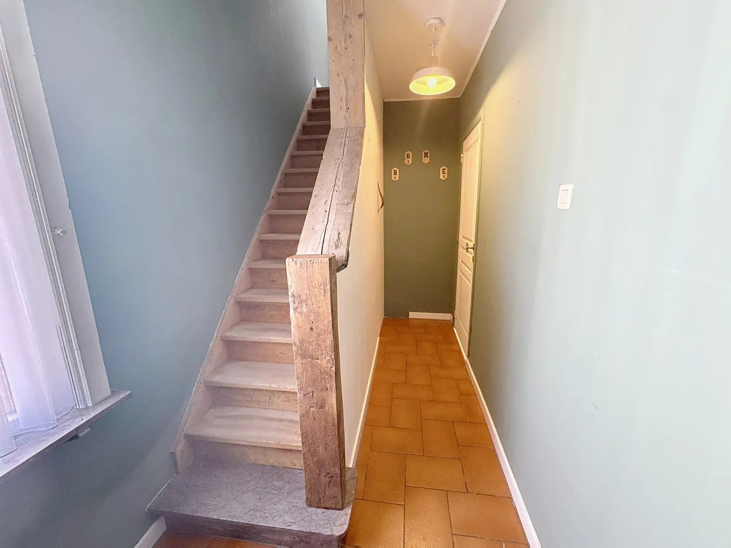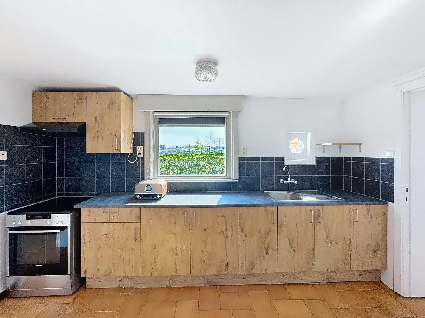 Deze rustig gelegen woning omvat een hal met toegang tot een kelder. Je komt binnen in een ruime, lichtrijke, gezellige leefruimte met eetplaats en salon. Als je doorloopt, kom je in de landelijke keuken. Achteraan is er nog een ruimte die kan dienen als wasplaats of berging. Daarna loop je door naar de badkamer voorzien van een douche en lavabo.