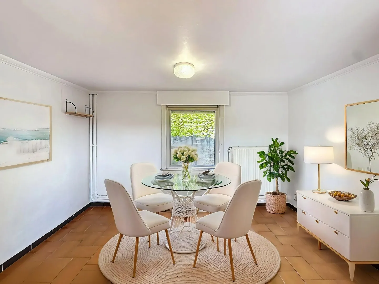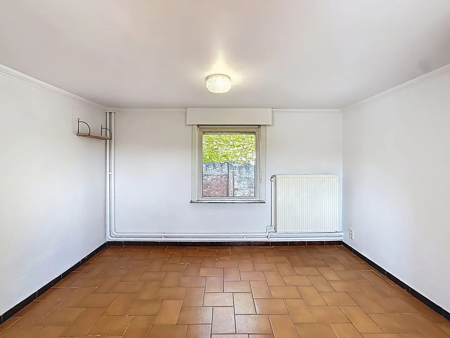 Deze rustig gelegen woning omvat een hal met toegang tot een kelder. Je komt binnen in een ruime, lichtrijke leefruimte met eetplaats en salon. Daarnaast bevindt zich de keuken. Achteraan is er nog een ruimte die kan dienen als wasplaats, berging of bureau. Daarna loop je door naar de badkamer voorzien van een douche en lavabo.