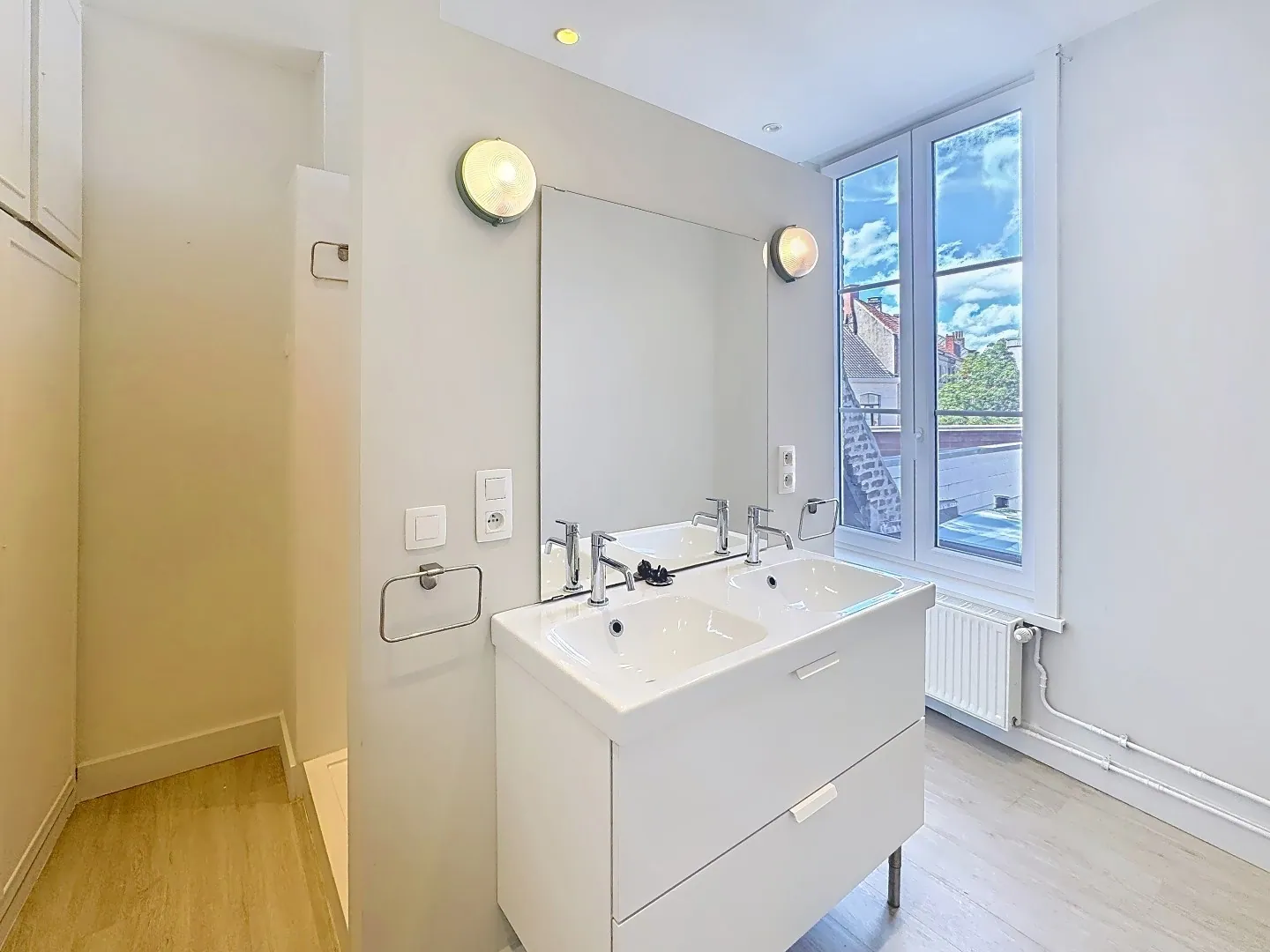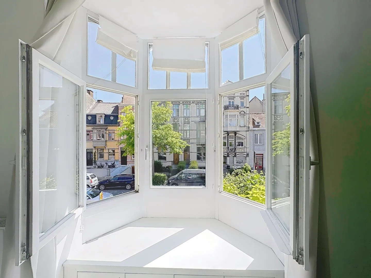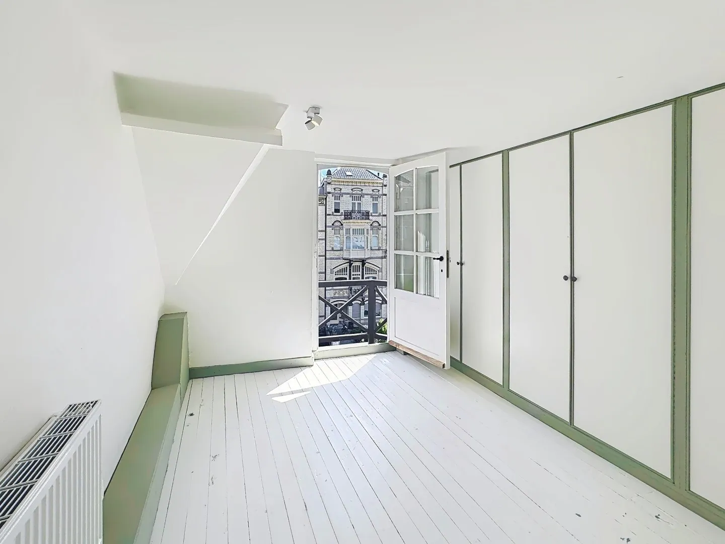 Op de eerste verdieping bevindt zich een ruime slaapkamer en een vernieuwde badkamer met douche. De bovenverdieping biedt nog een tweede slaapkamer (met velux en screen), met de mogelijkheid tot een derde kamer of bureau – mét zicht op de unieke gevels van deze statige residentiële straat.