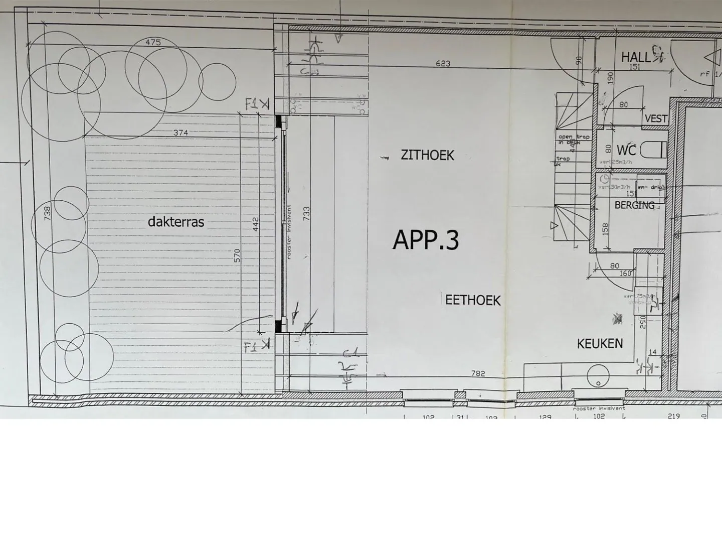 Via de trap kom je binnen in de hal met toilet. Een glazen deur leidt je in een mooie, ruime, lichtrijke living met open keuken.