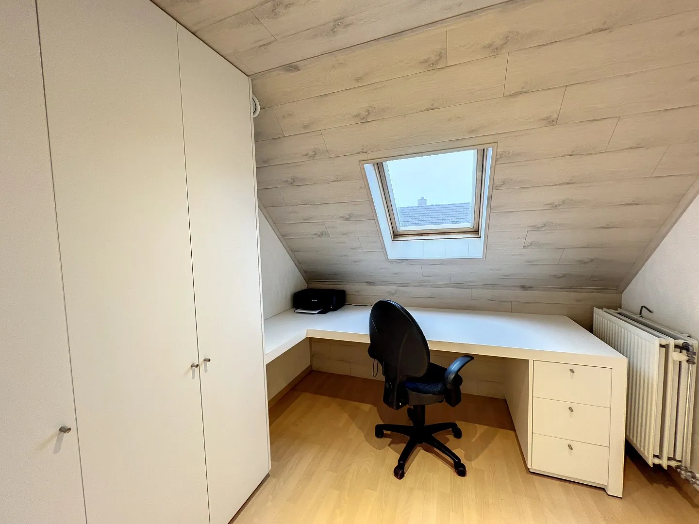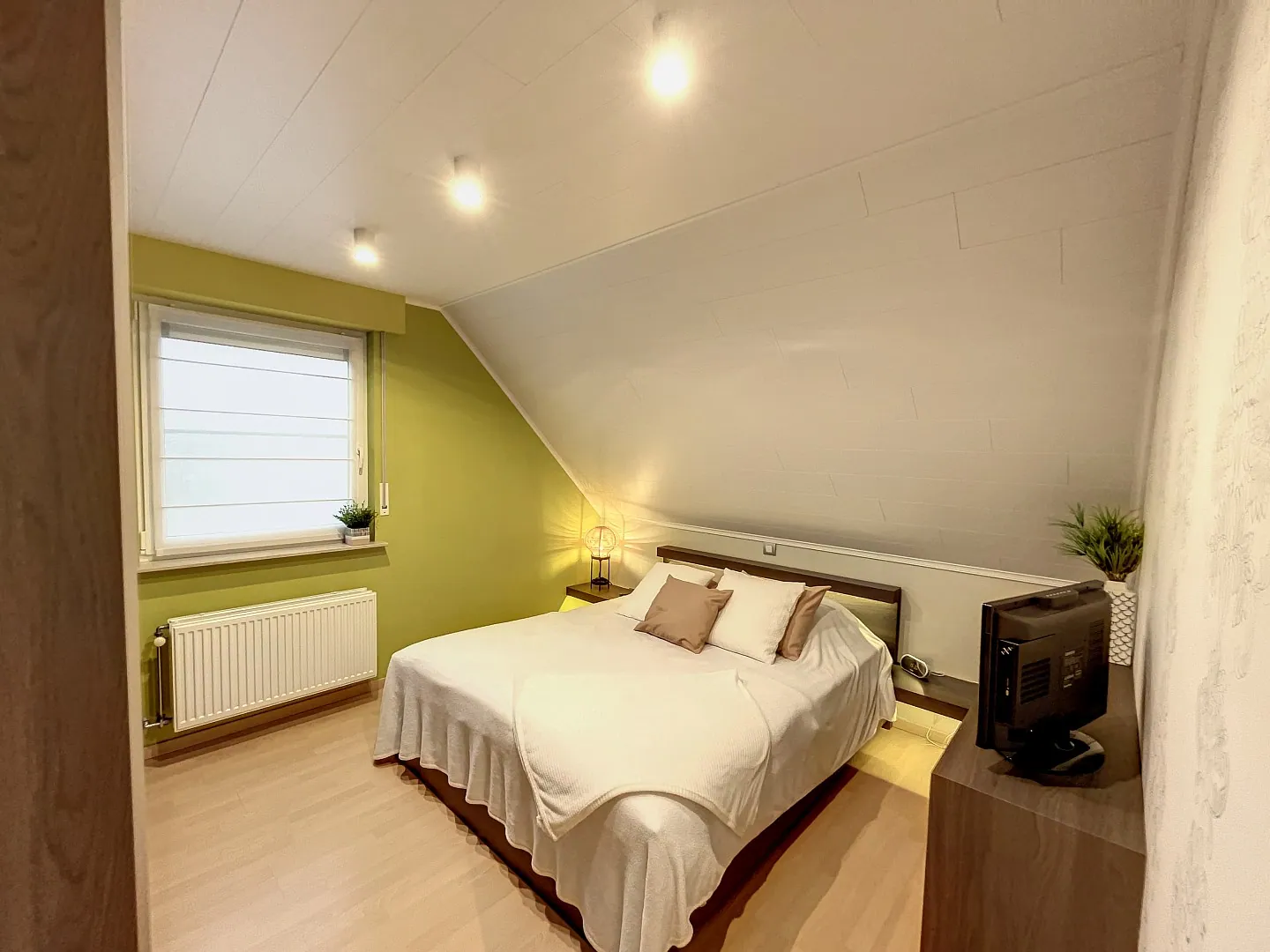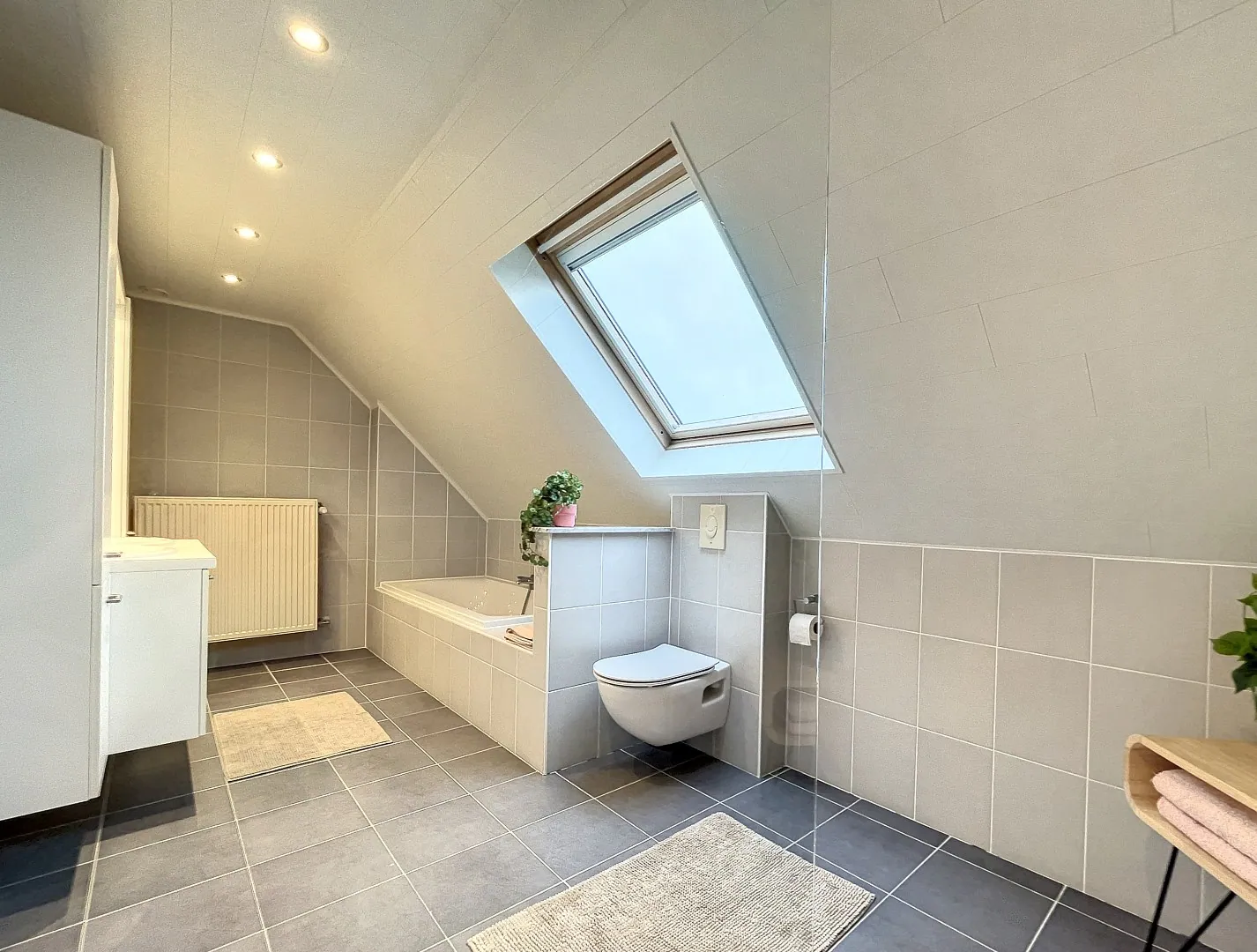 Boven zijn er vier slaapkamers en een heel ruime badkamer met douche, bad en dubbele lavabo. Een nette, geïsoleerde zolder biedt extra opbergruimte.