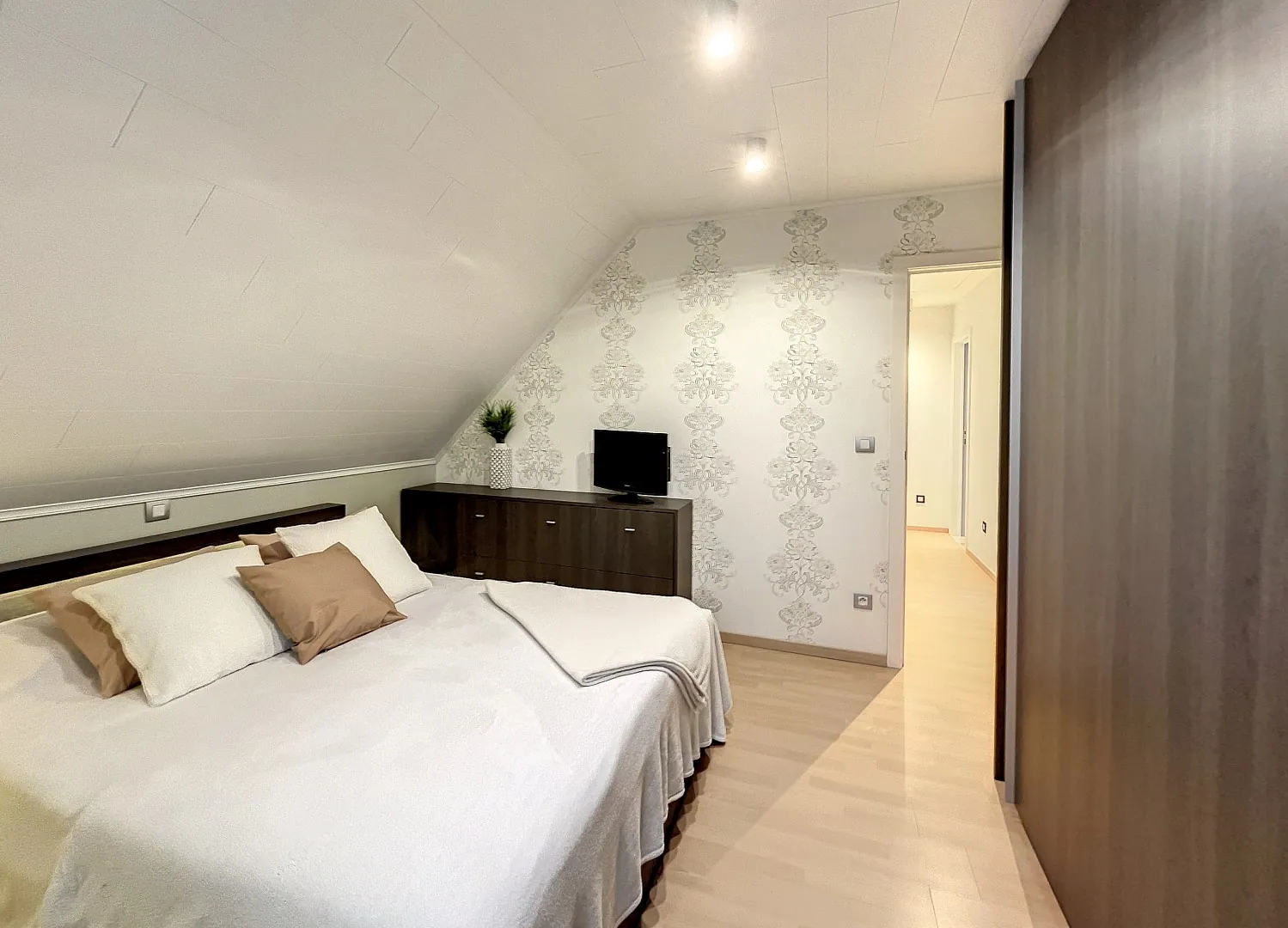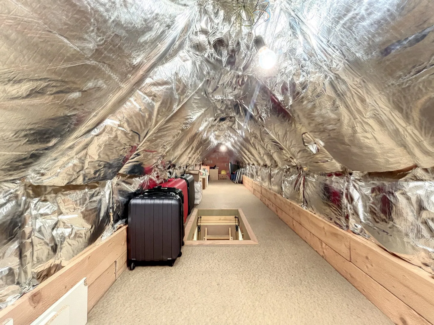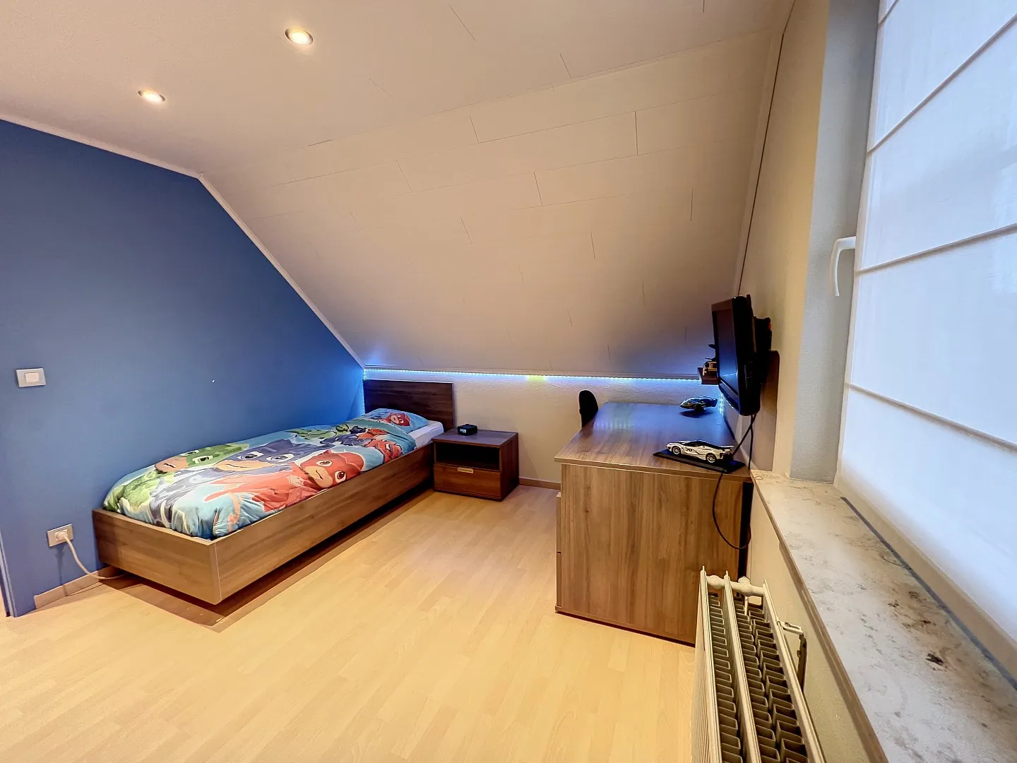 Boven zijn er vier slaapkamers en een heel ruime badkamer met douche, bad en dubbele lavabo. Een nette, geïsoleerde zolder biedt extra opbergruimte.