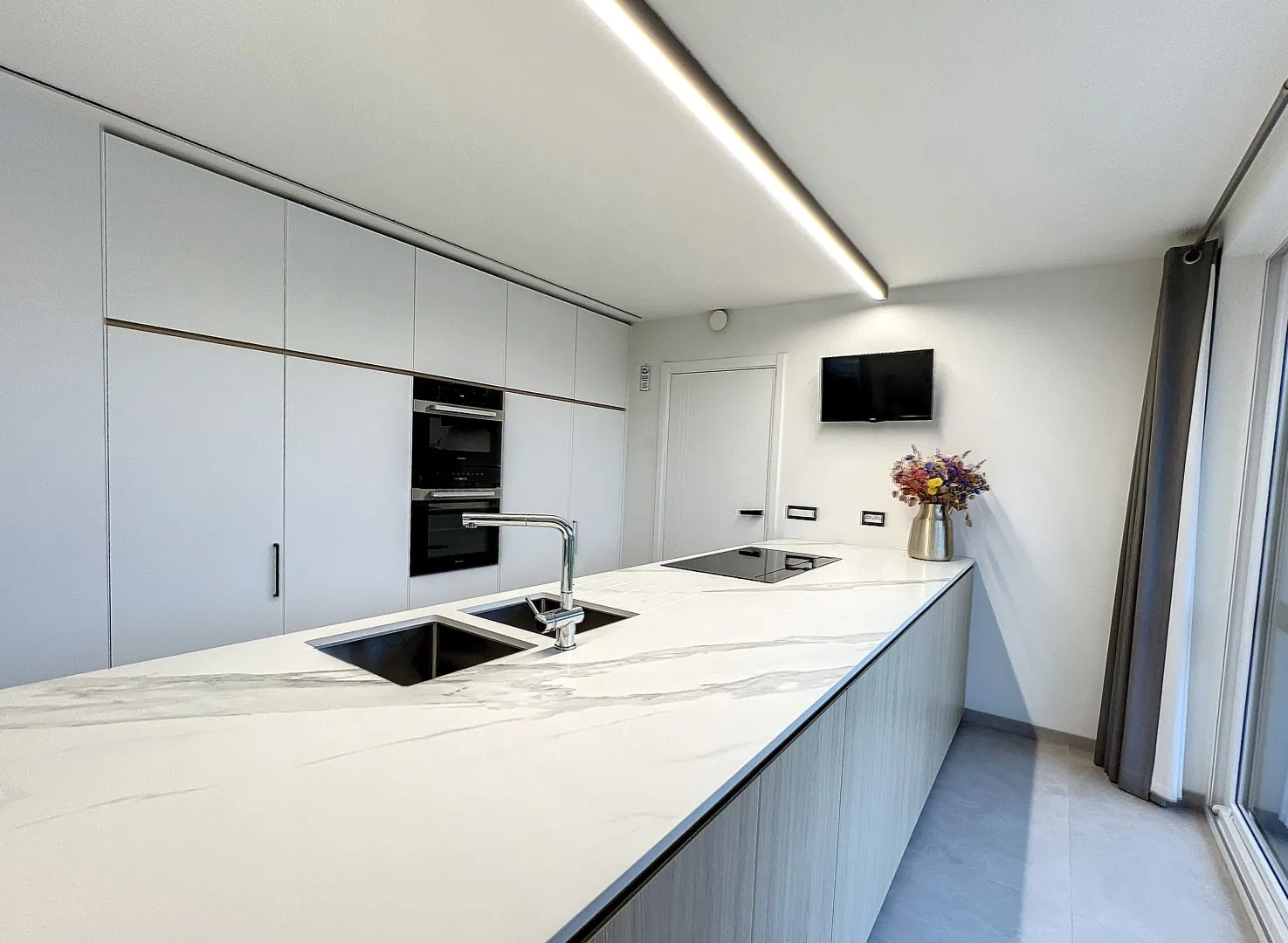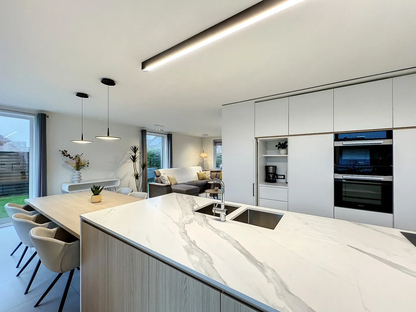 Rechts ga je binnen in een gezellige, lichtrijke living met aansluitend een luxueuze, op maat gemaakte open keuken die tot in de puntjes is afgewerkt door Coopman interieur. In de keuken en living is er een aangename warmte door de vloerverwarming. De keuken is uitgerust met een ingebouwde dampkap en inductiekookplaat van Novy. De oven, microgolfoven en vaatwas zijn van het merk Miele. Vanuit de keuken en living heb je een prachtig zicht op de mooi aangelegde, onderhoudsvriendelijke tuin voorzien van een robotmaaier en een tuinberging.