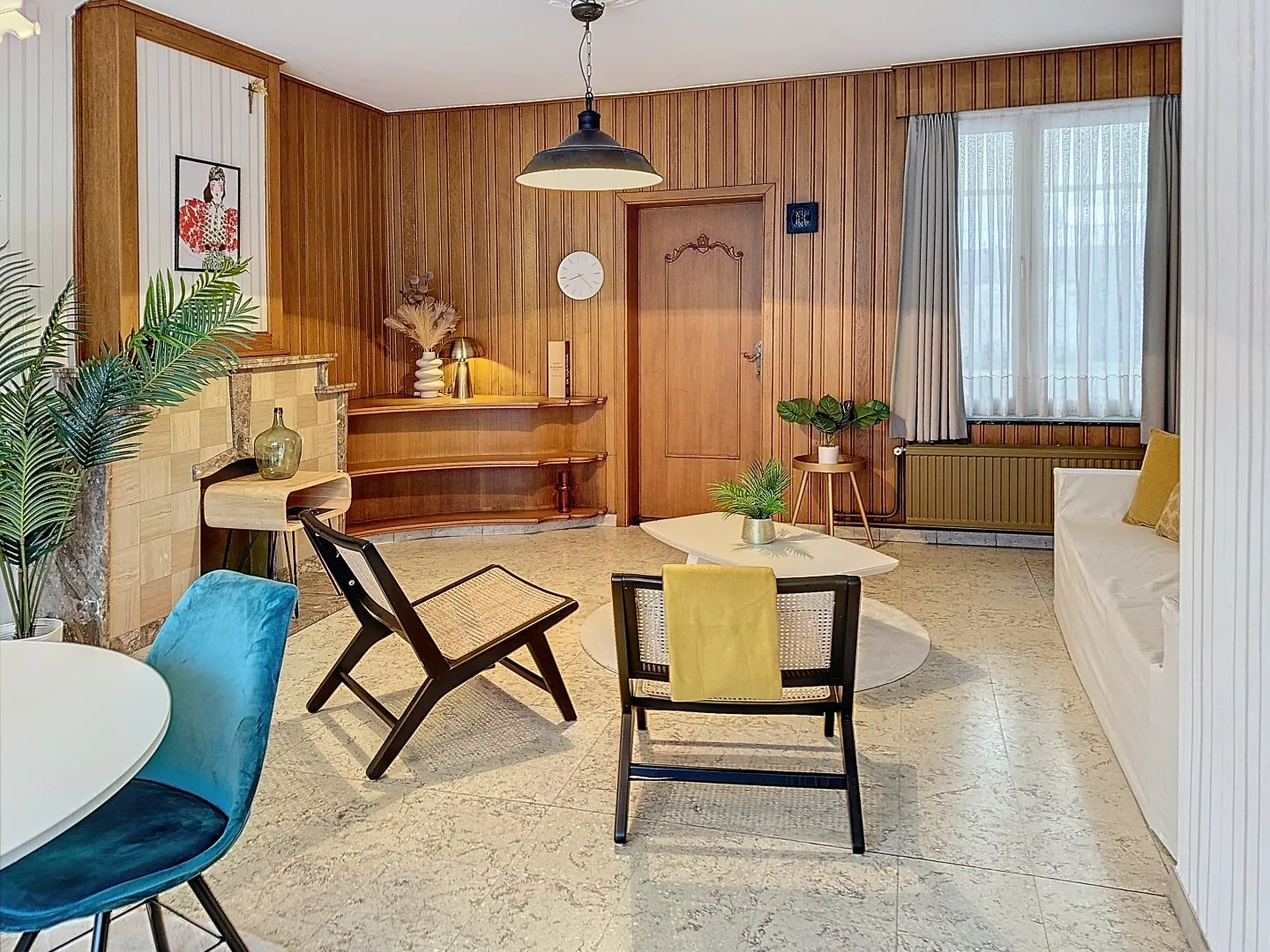 Via de hal ga je links binnen in de lichtrijke living. Rechts bevindt zich de keuken met zicht op de tuin en een droge kelder.